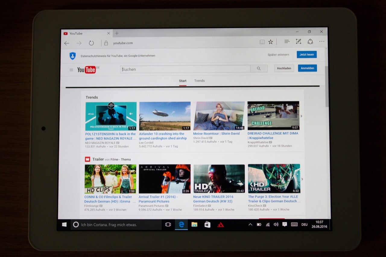 Das Officepaket in der Mobilversion ist vorinstalliert, doch es ist ein Office365-Konto notwendig, um zu arbeiten. Die Darstellung von Inhalten ist problemlos, aber das Arbeiten an Tabellen und Präsentationen am Tablet ist aus gutem Grund unbeliebt. Microsofts neuer Edge-Browser von Microsoft ist zwar noch nicht lange auf dem Markt, doch hat sich als Surfwerkzeug bewährt. YouTube-Videos in Full HD werden flüssig wiedergegeben, ebenso wie Inhalte auf Amazon InstantVideo.